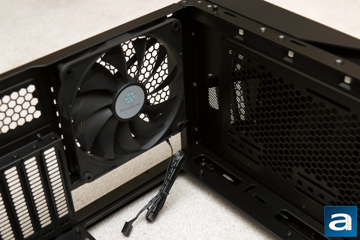 As I normally do, the first look we have inside the SilverStone Primera PM01-RGB is at the top-back corner. In this corner we have two things to speak of. One is the fan, which is a SilverStone specific fan. Unfortunately, not a lot of other information can be found on it, other than the fact it is a 140mm fan with a four-pin PWM connection. At the top of the case you can see the mounting slits for a top mounted option. This includes the option to either mount fans or radiators, with support of up to three 120mm or two 140mm fans. As for radiators, the top can accommodate up to 240mm, 280mm, or 360mm sized ones, as long as they do not interfere with the top components on the motherboard. This is less of an issue for radiators using 120mm fans, as they are offset away from the motherboard, while the 140mm fans take up all of the space. One improvement we do see here is the inclusion of a small routing hole near the back of the top frame. This allows you to pass the fan cables through here, which was something we complained about in the initial PM01. This is great to see SilverStone responding to a request with a simple solution. As with the original PM01 though, you can remove the top cover with a screwdriver to install these cooling options.