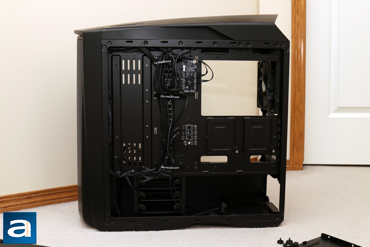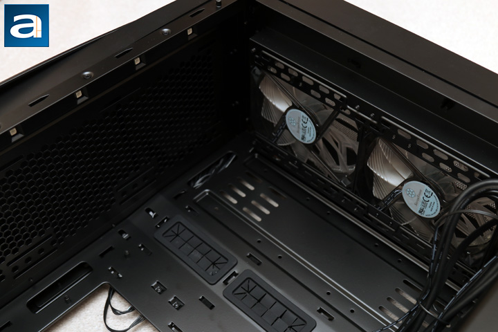 From here, you can see the power supply shroud closer and the bottom of the motherboard area. You can see the seven black expansion slot brackets here held in with a standard screw per slot. I was a bit surprised at the lack of thumbscrews, but considering you do not generally move expansion cards all the time, it is excusable. Even so, I would like to see more tool-free parts. As for the shroud, you can see this cover is not completely solid, as there are three holes that allow air to pass through the bottom and top area. The main hole is near the left side of the case, which is where users may route the power cables for their video cards. This hole is lined with a rubber grommet to hide any extra cables under this hole. However, two more holes are located closer to the motherboard for other plugs like the front audio jacks, front input pins, and fan headers.