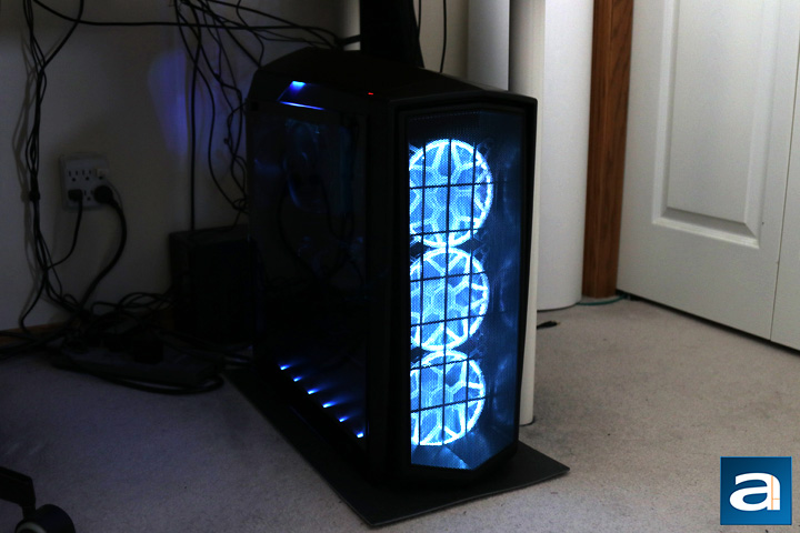According to the standard APH Networks sound scale, where 0 is silence and 10 is loud, the SilverStone Primera PM01-RGB is a 3.5/10 on everyday usage. However at full blast, the fans rage up to a lot more noticeable 6.0/10. Of course, it does move a whole lot of air through the case, and it does have four fans working overtime in this situation. Overall, I am still impressed at its sound performance. The unrestricted airflow from the front panel fans is definitely good to see, and the three intake fans do well to cool not only the motherboard components, but also the drives in the cage underneath.