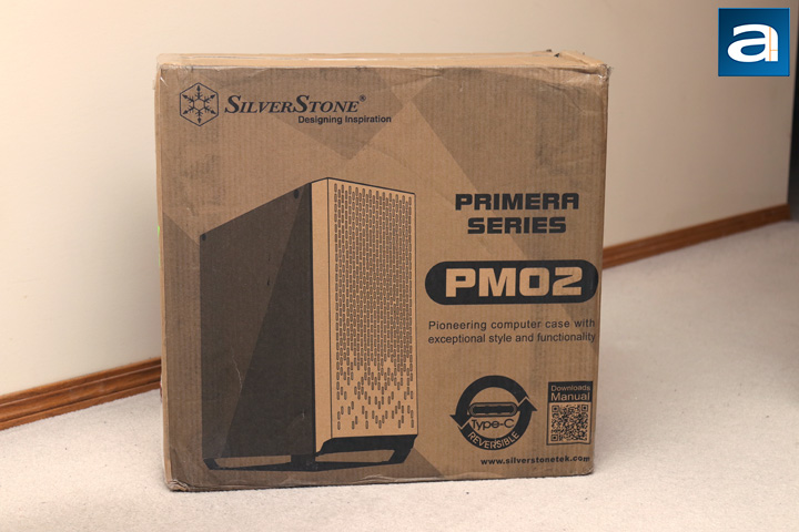 Today's review unit of the SilverStone Primera PM02 arrived from SilverStone's offices in Chino, California, in its retail container. Traveling via UPS and their Standard ground service, the Primera PM02 arrived in pretty good condition with no real exterior blemishes to speak about. There are still some dents and bruises on the edges of the box, however. The outside of the box is not the same full color experience we saw from the previous Primeras, but rather a more standard brown corrugated cardboard with black and white images. From the outside, you can already tell the PM02 has a pretty different styling compared to the last Primera we looked at, but we will get more into this later on. The front and sides of the box show off scaled images of the PM02, as well as some features and specifications.