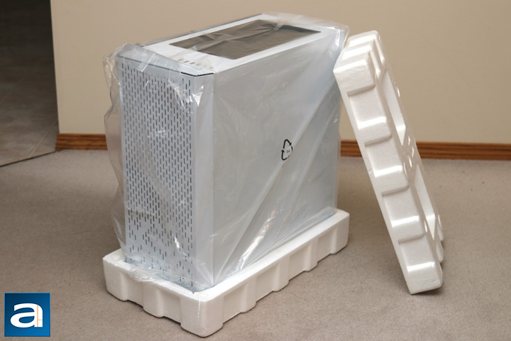 Out of the box, we have a pretty standard state of affairs when it comes to the SilverStone Primera PM02. The computer enclosure is enclosed in a plastic bag to prevent any surface scratches while in transit. Two large foam brackets also are fitted to the Primera PM02 to prevent any damage to the case itself. It is quite clear the shipment sustained some impact, as there are several cracks in the foam bracket. The glass panel also comes sealed with plastic wrap to prevent any smudges or scratches on the panel before the user receives it. Otherwise, inside the case we can find a small plastic bag holding all the screws and a user manual for assembling the case. Unlike typical SilverStone form, this manual is actually just a small fold out and barely covers any details regarding the Primera PM02. However, this is because SilverStone has made some changes to simplify the building process, as we will see later on.