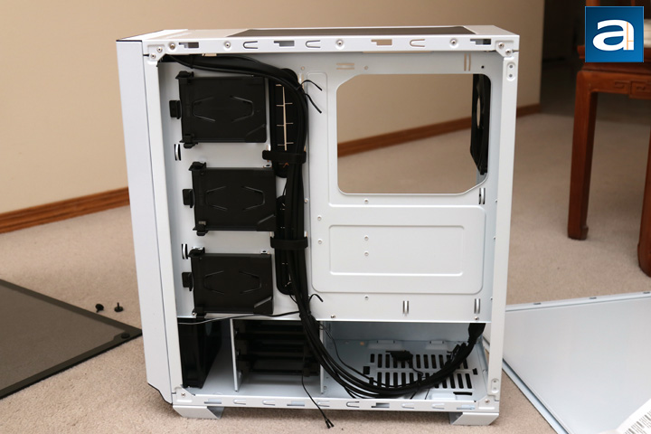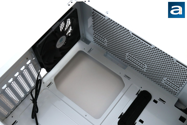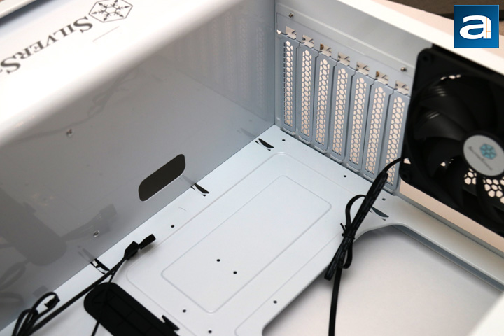 At this point of view, you can see the power supply shroud and the bottom of the motherboard area. You can also see the seven white expansion slot brackets here, held with the white door we mentioned on the previous page. Once again, I would have liked to see either a more tool-free way of mounting cards, but considering you do not generally move expansion cards all the time, it is excusable. As for the shroud, you can see this cover is pretty solid, though there is one hole to pass cables through. Interestingly enough, we actually do not have a hole closer to the left side panel where you could pass a power cable to the graphics card. In addition, with the single hole, it seems a bit small to pass through all your cables. Overall, the decision to remove these cabling paths is quite confusing to me and seems like a step backwards.