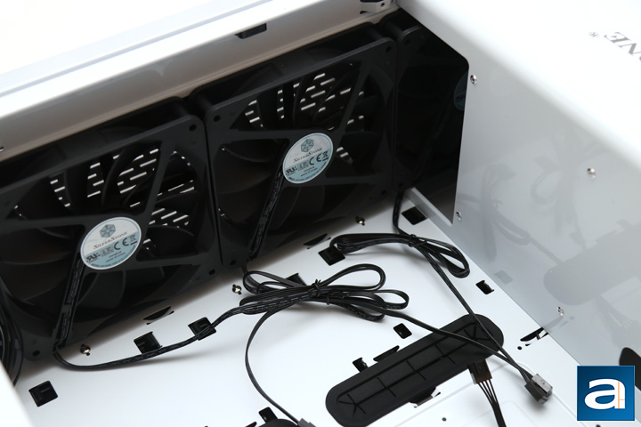 In the top-back corner of the SilverStone Primera PM02, we have two things to speak of. One is the SilverStone specific fan. Unfortunately, public information regarding any of the internal fans is quite scarce. All I can say is that this, along with all of the other included fans, is a 140mm fan with a four-pin PWM connection. This looks to be the same fan SilverStone provided on the rear of the Primera PM01-RGB. At the top of the case, you can see the mounting slits for a top mounted cooling option. This includes the option to mount either fans or radiators, with support of up to two 120mm or 140mm fans, two 120mm radiators, or a single 240mm or 280mm radiator. Thankfully, the mounting slits are also offset away from the motherboard to prevent any clearance issues you may have. Otherwise, a large opening at the back of the motherboard is cut out here to allow users to mount their CPU coolers and their backplate without removing the entire motherboard. The lip around this area, as well as other holes, have been smoothed over to prevent users from cutting themselves or from cutting through cables. Some other cutouts at the top exist to pass cables like the CPU power cable through.
