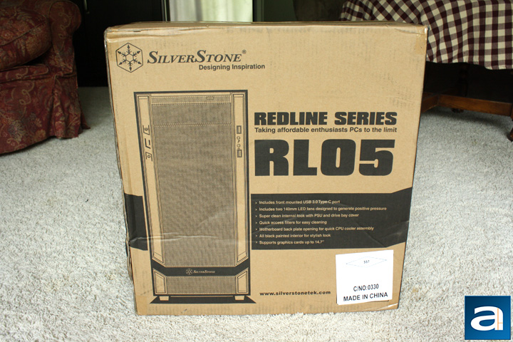 The SilverStone Redline RL05 arrived in a big brown corrugated box from Chino, California, USA. The front side had a big dent in it, but after opening up the box, there was no damage to the product. The shipping box has some information on the chassis. The front features the case, name, as well as the main selling features, such as the USB Type C and two 140mm red LED fans. The left side has all the technical specifications listed, while the right side has the features presented in a few different languages. The back side has a look at the case without the side panel to see all where all the hard drive mounts and cable management loops are. I proceeded to open up the packaging, and had a look at the SilverStone Redline RL05.