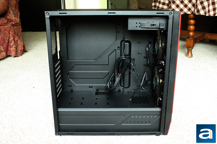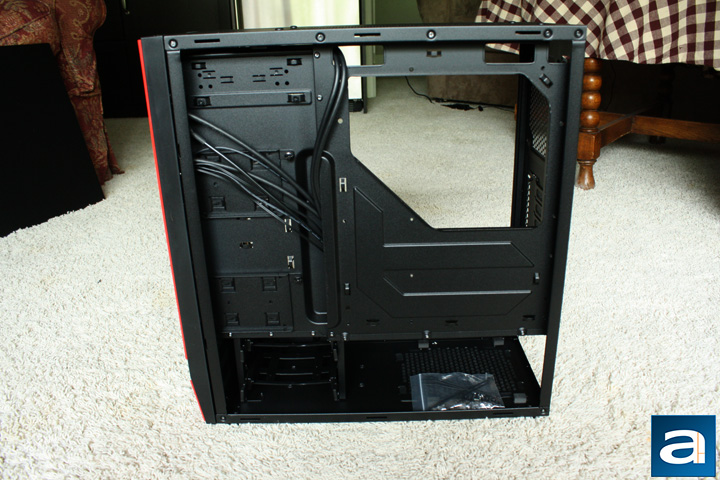 Here is a better view of the bottom compartment cover. From this view, you can see some more cable management cutouts along the bottom of the motherboard tray. They were useful, but I would expect more than one cutout. Having only one cutout at the bottom makes it harder to achieve a clean look, and the cables can be a bit squished depending if you have the front USB 3.0 cable plugged in. I have mentioned this before, but I appreciate a separate chamber for a power supply and all its cables, especially for a budget case. It really ensures a clean look without having to add a lot of effort.