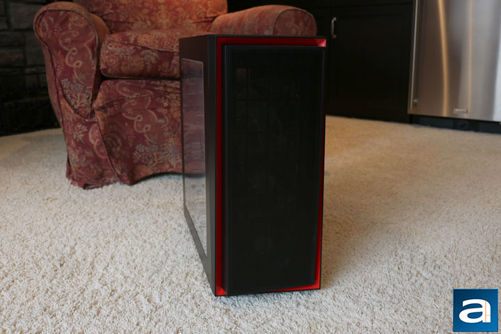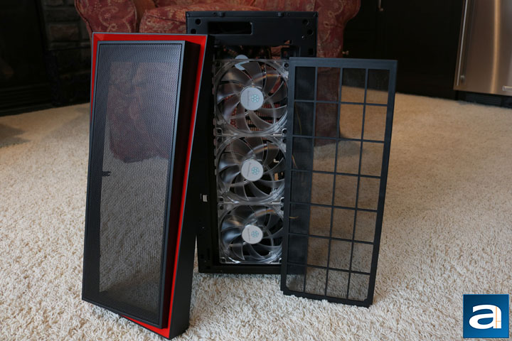 The front pops off easily on the SilverStone Redline RL06 Pro, which is always welcomed. This gives a better view of the front panel in how it is designed. The entire front area is an intake, and full advantage of it is taken with the three 120 mm fans. The mesh panel itself is already pretty fine, but there is an additional dust filter behind. The dust filter easily comes off, making it easy to clean when the time comes. Otherwise, the front can house up to a 240 mm radiator, giving it quite the cooling capability. It would have been nice to see the larger 280mm support, especially with the open nature of the RL06 Pro. The full mesh filter allows light to pass through, creating quite the look with red LED fans, similar in design to the SilverStone Primera PM01.