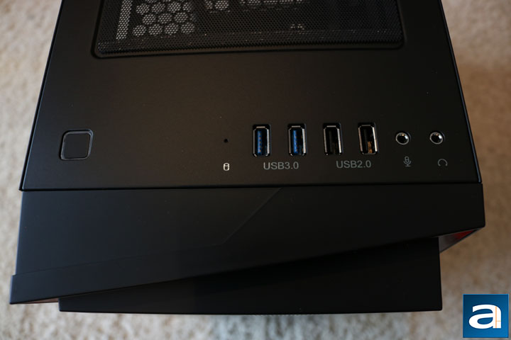 This top view helps to see the design of the front panel, specifically how each block slopes outward in a different direction. The top I/O is pretty basic. The power button is found to the left, while everything else is to the right of it. There is no reset button, which is fine, but it is always nice to have the flexibility. The rest of the I/O has the HDD activity LED, with two USB 3.0 ports, two USB 2.0 ports, and the headphone and microphone jacks. Curiously, there is no USB Type-C port, which was in the Redline RL05. This is rather disappointing, as USB-C is gaining popularity, and it really should not have been omitted. The power button, on the other hand, has a much better tactile feedback than the SilverStone Redline RL05's power button, which is quite nice. It also has an LED ring around it, which illuminates in red. From this view, you can also see how well all the different pieces of the case fit together. Toward the top of the picture is the beginning of another dust filter. It sticks to the top magnetically, and just like the front dust filter, it is well made.