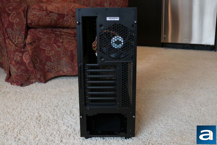 At the back of the SilverStone Redline RL06 Pro, we find a traditional design with the power supply found at the bottom, seven expansion slots above it, the motherboard I/O to the left, and a 120 mm exhaust fan to the right. Some cost saving measures have been taken on the cabling of the fan, as they are our favorite ketchup and mustard colored cables. The same is true for the front fans. "Made in China" is found at the top, not as a sticker, but engraved in the metal. Neither the finish nor the color on the back changes, ensuring the entire theme of the case stays consistent.