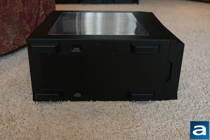 The bottom features four large feet to raise the Redline RL06 Pro slightly off the ground. Each of the feet has some rubber to help with grip on more slippery floors. These feet are not tall enough for the case to be used on carpet, as the lack of height can still translate into the carpet blocking adequate air intake to the power supply vent. The dust filter found on the bottom is not the best quality with no plastic frame, and just a flimsy piece of mesh. Furthermore, it is not on rails. Overall, this bottom area is fairly standard. Its finish is the same as the rest of the case.