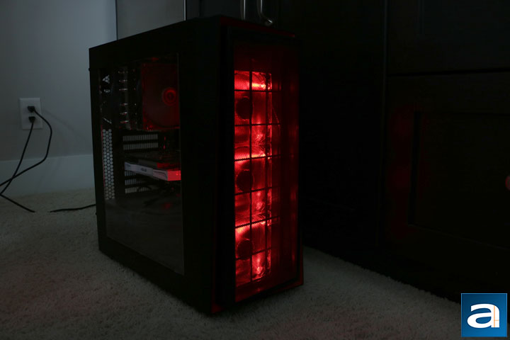 This is the final look of the SilverStone Redline RL06 Pro with my parts installed. My white graphics card is not really conducive to the overall black and red theme. Regardless, the front three fans light up when you turn it on, reminding me of the SilverStone Primera PM01. Overall, I find it to look pretty good. The SilverStone Redline RL06 Pro finds a nice balance in aesthetic between a standard looking chassis, while making the front look unique. Even though silence is not a big part of the RL06 Pro, it was not too bad either. On a scale from 0 to 10, where 0 is silent and 10 is a jet taking off, the overall sound came in at 4.0/10 in my personal opinion. The fans were not overly loud and came in at 3.5/10.
