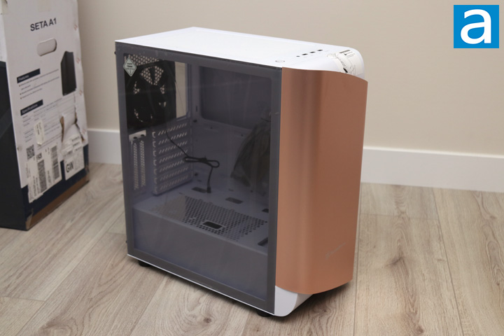 Even after writing with APH Networks for quite some time now, I still do not fully understand the love of pink from our Editor-in-Chief Jonathan Kwan. However, the rose gold option is the SilverStone SETA A1 we received. It looks like SilverStone has channeled their inner Apple, as the three colors here are the same as some of the older model lines of iPhones. Even so, the rose gold and white combination is a nice looking combination. In some different lighting, the case can look bronze-like. It is not something we have seen before from other cases, as it mixes the pink color quite tastefully with a more standard white shell. However, SilverStone has made pink cases in the past, so it should not be too surprising. The front panel shows a diagonal wave that protrudes out. There is a notable gap between the rose gold aluminum and the white metal frame behind it to allow air to pass through at the front. This is important for intake, as we will see later on. One thing we should mention is the large white paper sticker from SilverStone to show how to remove the front panel. It is sort of annoying they used a sticker that is hard to remove, as it left quite a bit of sticky residue after removing this sticker. Moving on, the left tempered glass panel is tinted gray to slightly hide internal components, though most of your internal components will still be easily seen through the glass. Another sticker is placed on the side glass, but this is on top of the large plastic wrap that can be removed without leaving anything behind.