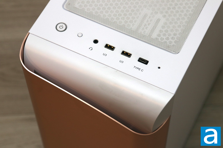 Taking a look from this top angle, you can see how the aluminum panel curves around the front panel and creates about a slim gap at the top and bottom. The rest of the front panel curves down at the top to the front. Moving slightly back, we have all of the front-facing I/O here. From left to right, we have the power button, reset button, single 3.5mm combination audio and microphone jack, two USB 3.1 Gen 1 Type-A, one USB 3.1 Gen 2 Type C, and a single LED light for drive activity. I find it a bit strange to see the rise of the single audio and microphone jack at the front, especially on desktop computers, but this is becoming the norm on more recent cases. Finally, behind the inputs and outputs, we have a large opening for exhausting air out the top. From the outside, we have a full white mesh cover held on with magnetic strips. I am happy to see they used the same white color as the rest of the exterior, when they could have slapped on a black mesh. Otherwise, the magnet strips on the mesh secure well to the case while making the mesh easily removed for cleaning.