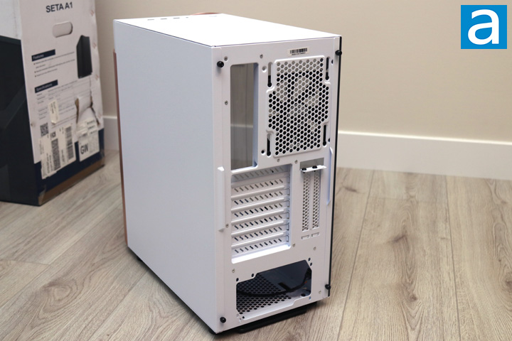 Moving to the back, we have a pretty typical layout from the SilverStone SETA A1. Starting at the top, we have the motherboard opening on the left side, with rails for an exhaust fan on the back. SilverStone does have a single 120mm fan mounted here. Underneath, we have the seven openings for the PCI Express slots and two more on the right side for vertical slots. It is a bit strange to see that the horizontal ones are the punch out type that do not just mounted in place. After some communication with SilverStone, it seems like we got a bad sample of the SETA A1, as it should actually come with removable expansion slots. At the bottom, we have an opening for an ATX power supply. As for the right side panel, we have a solid steel panel, held on with standard thumbscrews.
