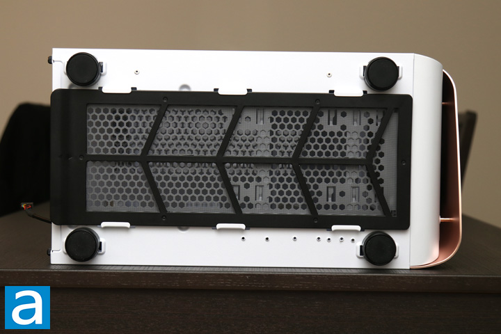 Flipping the case over, we have a better look at the base of the SilverStone SETA A1. In each corner, we have a plastic foot with rubber padding on the bottom to hold the case in place while reducing vibrations between the case and the surface it sits upon. In between the feet, we have a large plastic bracket with a mesh lining here. This prevents dust from entering at the bottom of the case and makes cleaning easier since the bracket is easily removable from the back. Under the mesh filter, you can see there are holes in a honeycomb pattern to allow air to enter or exit.