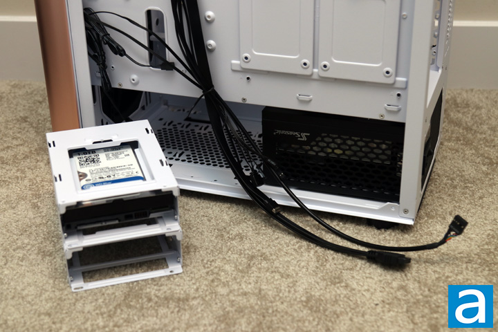 Unsurprisingly, I started by installing the power supply in the basement and routing the necessary cables to the intended places. The power supply in question here is the Seasonic PRIME 600 Titanium Fanless 600W, which is a pretty lengthy unit at 17cm. SilverStone says that a maximum of 18cm clearance is available with the drive cage installed, so I got only at a centimeter of space left for cables. As such, I could only install one of the drive caddies into the case. I installed a Western Digital Blue 1TB into the cage and plugged in the necessary power cables. Once again, it is great to see the number of drives you can put in this compact mid-tower ATX case, though you should keep your power supply length in mind if you are using 3.5" hard drives. Finally, I routed the necessary cables for powering different components here and mounted the power supply in place. Overall, the amount of cabling space at the back is pretty sufficient, as I did not run into any issues, even with thicker cables like the bundled 24-pin motherboard cable.