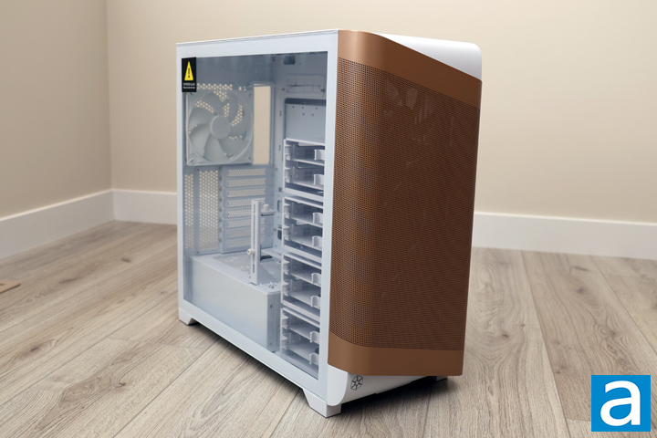 Unsurprisingly, the SilverStone SETA A2 reminds me of the SETA A1 I reviewed over five years ago. This includes similar color options of rose gold-white or black. On the front, we have the same diagonal aluminum front panel that curves outwards for a unique look. The previous SETA A1 was a bit curvier with this diagonal wave, but the overall design language remains the same. Also, our SETA A2 looks more bronze and less rose colored. There is a notable gap between the aluminum and the white plastic front panel, but it is filled in with a large translucent light diffuser. This helps the RGB LED light strips on the front panel spread out light more evenly. Conversely, the front pane has many holes to let air pass through the front. A SilverStone logo is located on the bottom left corner of the front panel. On the side, there is a tempered glass panel that is not tinted and easy to see through. Plastic shrink wrap covers both sides to provide some protection on the glass pane. While the SETA A2 is not a big departure from the original design, it incorporates a bit more function with the front perforated design without changing the form.