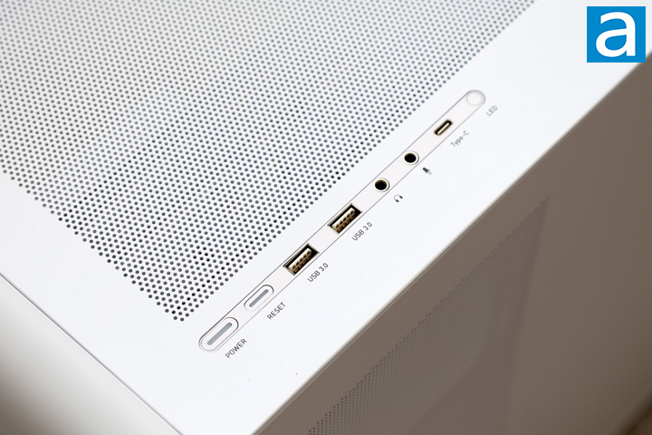 From the top, this is a better view of the user-facing I/O. These inputs and outputs are placed along a thin column and look quite clean together. From front to back, we have power and reset buttons. The buttons both have LEDs behind the buttons to indicate power and drive activity, respectively. Next, we have two USB 3.1 Type-A ports, a pair of 3.5mm audio jacks for headphones and a microphone, and a USB 3.2 Gen 2 Type-C port. Finally, we have a small LED button that controls the integrated lighting. It is nice to see a dedicated button, as some case manufacturers tell users to use the reset button instead. Beside this column is an array of ventilation holes. This ensures airflow through the top region.