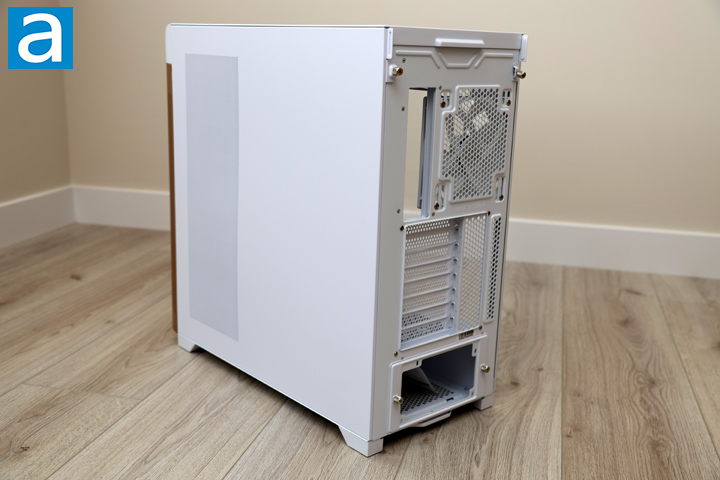 Looking at the other side, there is a solid steel panel with a column of ventilation near the front. This ensures air can flow in and out of the case when you mount fans or radiators along the side. At the back, there is a large slot at the top for the motherboard I/O with a ventilation area to mount a single 120mm or 140mm exhaust fan or radiator. A single 140mm fan is already installed here. Underneath, there are eight expansion slots, which are all perforated for more airflow. They are held to the rest of the case with standard screws. Finally, at the bottom, there is a bracket with an opening for an ATX-sized power supply.