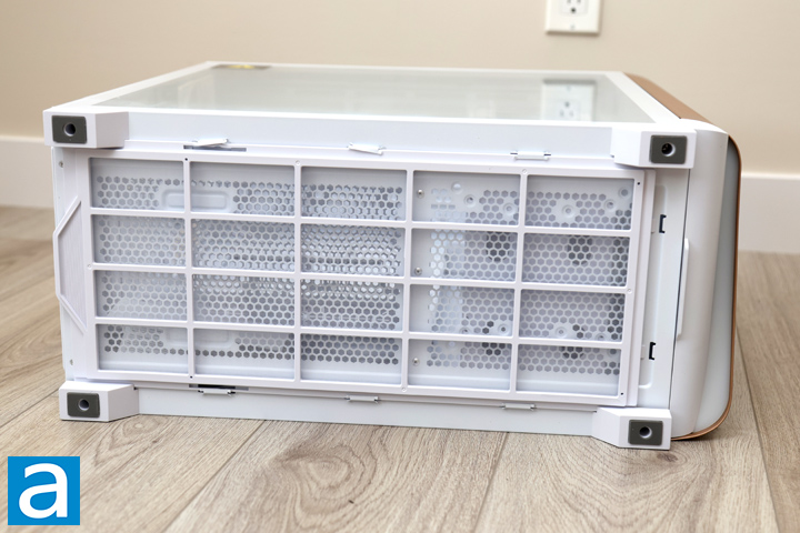 On the bottom, the SilverStone SETA A2 has a few things to note. In the middle is a large plastic frame and fine mesh that covers all the ventilation holes underneath. This frame sits on a set of metal guides to keep it all in place. You can see, however, the metal guides were damaged in multiple places. This likely occurred during shipping, but thankfully, it did not hamper the sliding frame from moving. The frame can be removed from the back of the SETA A2 for cleaning purposes. In each corner is a plastic foot with some rubber padding in place to ensure the computer case does not move about. With feet, they raise the entire SETA A2 off the surface by around 21mm, allowing for sufficient room for air intake or exhaust. At the front, a small lip is present to help you pull off the front panel with ease.