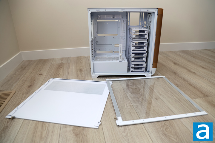 Once the panels are off, you can get a better look at the interior layout of the SilverStone SETA A2. As you already know, this case utilizes an open concept with a large set of drive cages included. The primary permanent division can be found at the bottom of the case. This sections off the power supply area from the rest of the chassis. It is not a solid division, as holes exist on this separation to allow air to pass through. The main area of the SETA A2 is where you can mount up to an extended ATX or SSI-CEB motherboard. Smaller motherboard form factors also fit here, including micro ATX and mini ITX, although you may need to move the pre-installed standoffs. All the included accessories can be found in a sealed plastic bag. Internally, everything is the same white color, which is a significant improvement over the original SETA A1. The paint on the panels is applied evenly and does not scratch off easily.