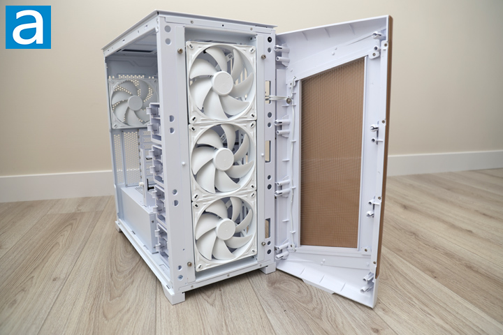 Removing the front requires a bit of caution, as there are cables running between the chassis and the front panel. These cables power and control the addressable RGB LED light strips at the front. After some careful jimmying, I was able to remove this panel to reveal the three 140mm fans hidden behind the aluminum. The specifications of the fans are not provided, but these are 3-pin voltage-controlled fans, which is a bit of a shame. Otherwise, you will see there is no mesh behind the perforations. This is a common trait across all the air vents on the SETA A2. The perforations should be fine enough for larger particles, but smaller dust can still get through here and accumulate inside, so I would prefer a slightly finer mesh on all the vents.