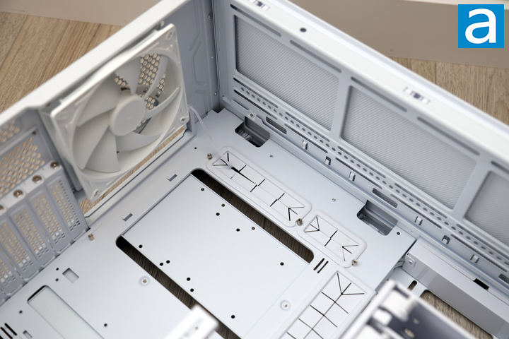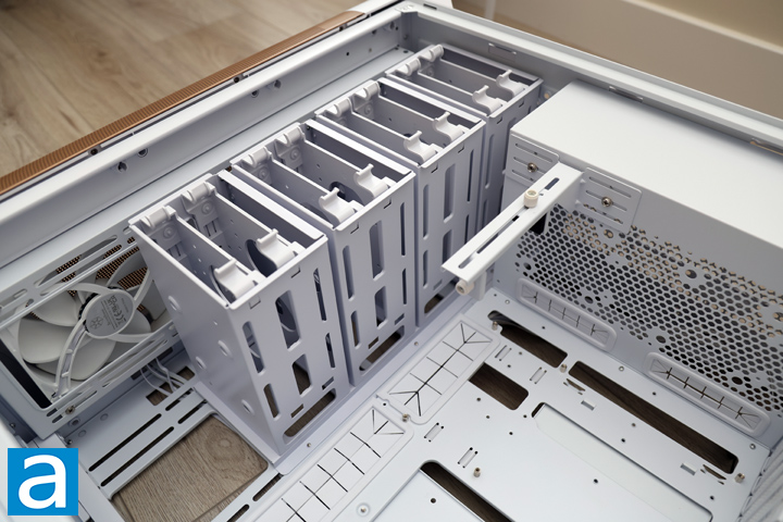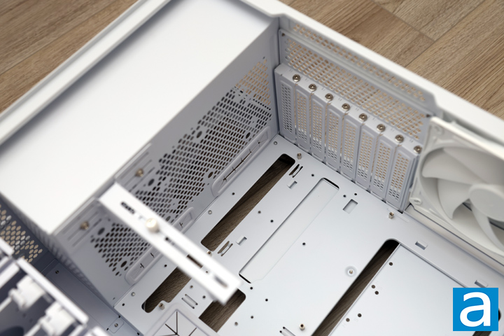 At the front area, there are rails on both the front and side to install up to three 140mm fans or a single 420mm radiator. There is more than enough height to ensure the largest size radiator can fit here without any issue. Once again, you will need to remove the complete set of drive cages to get access here. Next to the storage area is a single piece of metal with multiple portions attached. This is a video card bracket that supports your GPU. It is nice to see one included with the SETA A2. Finally, there is a row of cable management holes with rubber grommets lining them to hide cable clutter. These holes are wide enough to also support back power connections on your motherboard.