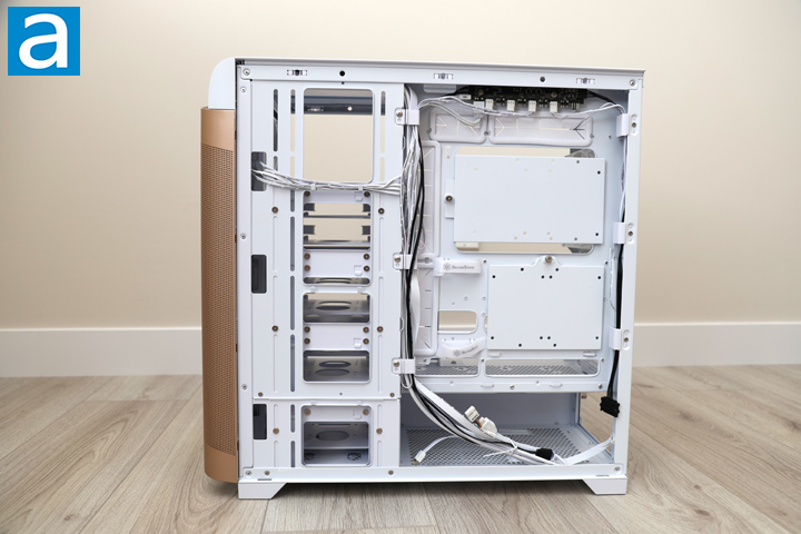 Moving on, you can see the front area where the ventilation and drive cages exist is close to the side panel, so you will need to route any drive cables to the side. In the middle of the SETA A2, there is a cabling area with three plastic cable collectors. This holds all the cables by default and contains them in an area that does not easily get tangled. Another pair of plastic holders are on the back side of the SETA A2. SilverStone has also included a pair of white Velcro straps to further aid with excess cables. With all these holders in mind, I did not need any more cable anchor points, although some may want some. In terms of cabling space, there is a total of 32mm, which is sufficient for most thick cables.