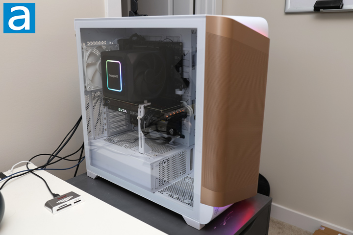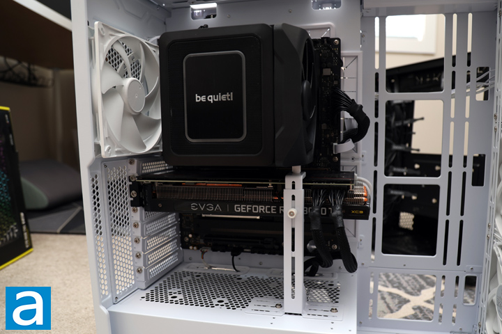 In the main compartment of the SilverStone SETA A2, I installed my ASUS ProArt X870E-Creator Wi-Fi motherboard with an AMD Ryzen 7 9700X mounted inside. Beside it is a set of Crucial Pro Overclocking DDR5-6400 2x16GB memory. The cooler on top of the processor is the be quiet! Dark Rock Elite. According to SilverStone, users can put an air cooler as tall as 190mm, which is more than enough space for tall CPU coolers. Afterwards, I mounted the EVGA GeForce RTX 3070 Ti XC3 ULTRA GAMING into the top slot of my motherboard. Its 285.37mm length is still well within the maximum 438mm length that SilverStone specifies for any video card. I continued by plugging the necessary cables and front I/O. I appreciate the single front I/O pin header for faster installation. The routing holes were all in accessible spots with rubber grommets that helped with hiding the cable clutter.