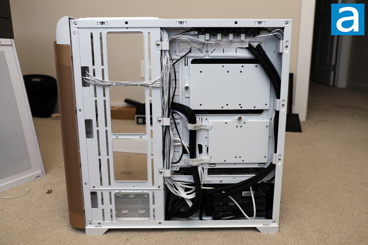 With everything installed, you can see the cabling situation at the back. I used the middle area as much as possible to secure thicker cables. With all the plastic cable clips and straps to manage the wires, I did not find myself needing any more cable anchor points. As well, with more than ample spacing behind the motherboard, I did not have any issues installing the side panels back in place. The rubber grommets on all the holes held in place and did not fall off accidentally. Overall, the whole SilverStone SETA A2 was easy to work in.
