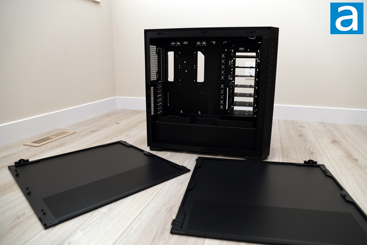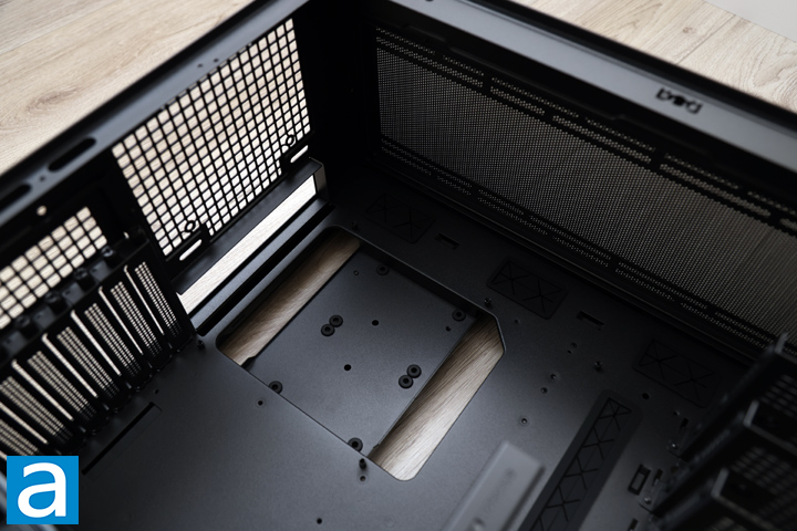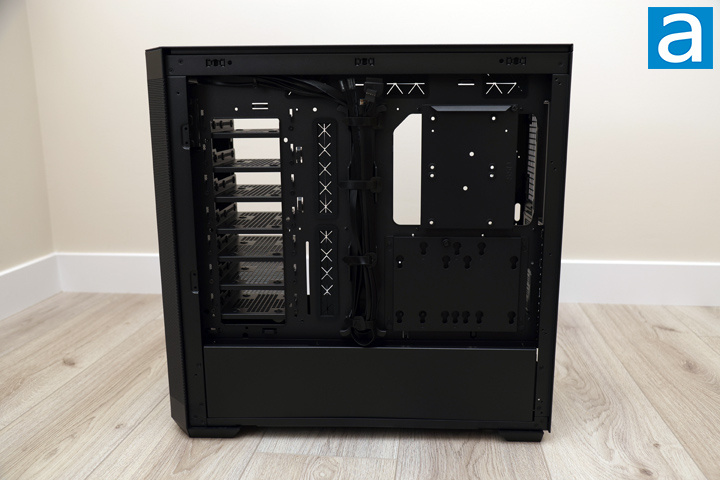 With the side panels removed, the SilverStone SETA H2 has an open-concept design with a divided basement to separate the power supply from the rest of the system. The upper area is where majority of your components will sit, including the many drive cages near the front. This case can accommodate motherboards up to SSI-EEB and E-ATX form factors. For those who do not know, SSI-EEB comes from the Server System Infrastructure Forum. They define motherboard sizing for workstation and server applications. Of course, SETA H2 also supports smaller boards if you move the motherboard standoffs. Everything inside is the same black color, which is consistent across the board. The paint on these panels is applied evenly and does not scratch off easily.