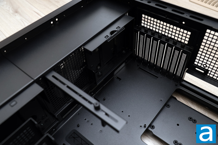 At the front, there are rails to install up to three 140mm fans or a single 420mm radiator. Due to the frame around the front, you will need to mount the fan and radiator with the fans closer to the exterior of the case rather than the other side. Once again, you will also need to remove these drive sleds for a radiator to be installed here. Out of the box, we do not have any fans included in the SETA H2. The front ventilation frame sits with metal pegs that slot into the case, but can be easily removed from the outside. Next to the storage area is a single metal piece with a thumbscrew attached. This is a video card sag bracket that provides support to your GPU. It is nice to see one of these out of the box, as many manufacturers make you find your own. Finally, there is a row of cable management holes with rubber grommets lining them to hide any cable clutter.