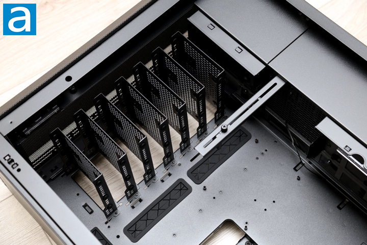 Down to the bottom, we can see the expansion slot covers. There is a total of eight slots, which is typical for a full-tower case. At the bottom, you can see the division between the power supply and the rest of the chassis. There are ventilation holes on the shroud to allow for air to pass through. You can also see a single drive cage here so you can install a 3.5" or 2.5" storage option here. There are more routing holes on the shroud to pass in cables at the bottom. This is likely where you will direct the case cables and the video card power connector.