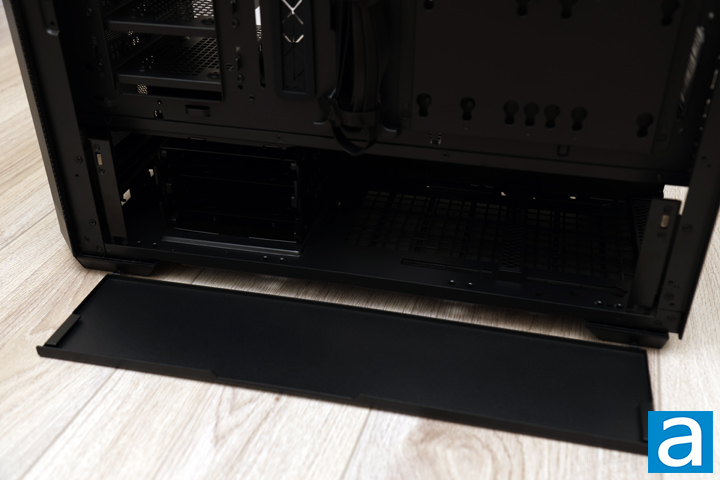 Finally, there is one more door at the bottom that hides the power supply and the rest of the basement. This door is held on with strong magnets on both sides, ensuring it does not swing open on its own. Once it swings out, you can pull the whole door off. When closed, there is a sizeable gap for cables to route through. In the basement at the front, we have yet another drive cage to hold two more storage options, either 3.5" or 2.5". It is clear the SilverStone SETA H2 is intended to hold a lot of drives, with up to a maximum of twelve 3.5", thirteen 2.5", or a maximum combination of fifteen locations for storage. It is not often we see cases with this sort of capacity, so I am quite pleased. Thumbscrews hold this final cage in place, so you can remove it if you need more space for your power supply. Speaking of which, at the back is a pair of plastic brackets to hold the power supply up off the bottom of the SETA H2. It is lined with some small rubber feet that help with reducing any vibration between the power supply and the rest of the case while also keeping the PSU in place.