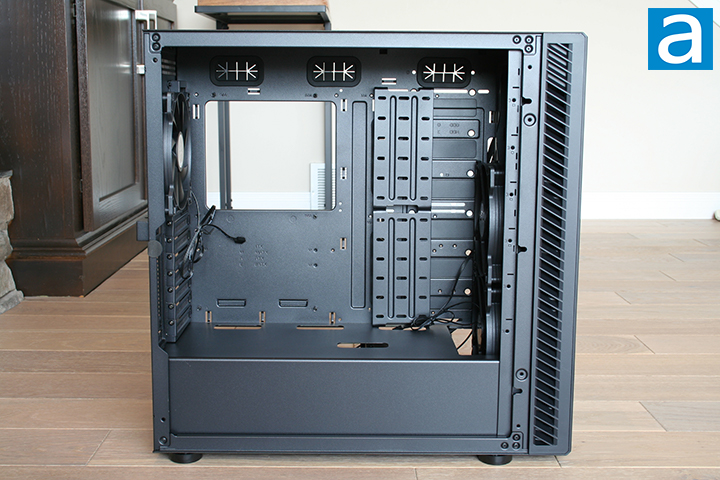 Both side panels are easy to remove thanks to the large thumb screws holding them in place. The thumbscrews are very comfortable to grip and can be easily unscrewed with your hands. As seen from the previous page, neither side panels have tempered glass and are instead treated with foam padding to absorb any inside noise. This design makes the SilverStone SETA Q1 the highest-rated soundproof case by Cybernetics. With the side panels removed, we can view the interior of the SilverStone SETA Q1. The black color of the case is consistent all throughout the interior, which is nothing special per se, but is still nice to look at. The PSU shroud covers a good portion of the bottom with the exceptions of having an opening in the front for radiator mounting and some cutouts just below the motherboard area. The motherboard area is large enough to mount various motherboard sizes including ATX, mATX, and ITX.