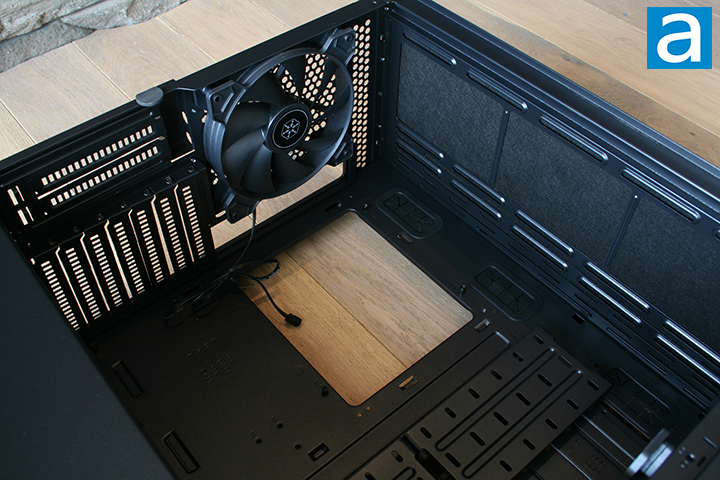 At the top, we can see mounting holes for case fans or radiators. According to SilverStone, the roof of the case is capable of fitting three 120mm or 140mm fans. It is also capable of fitting a 120mm, 140mm, 240mm, 280mm, or 360mm radiator. The maximum CPU cooler height is specified at 182mm. The included dust filter top panel will need to be used instead of the default sound-dampened panel when you have fans or a radiator in this location.