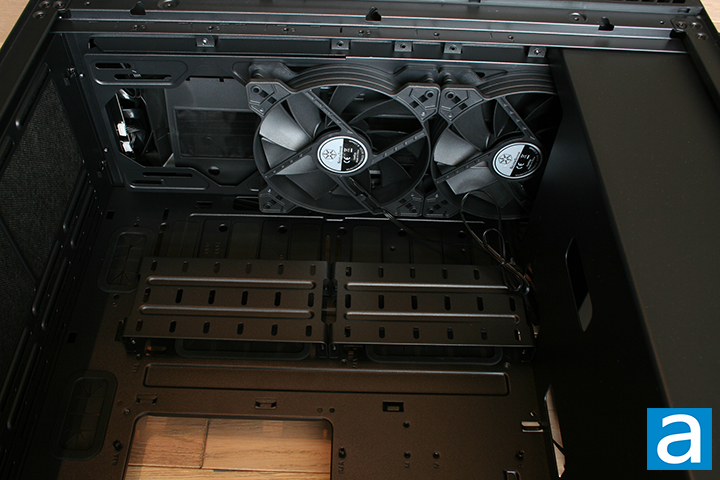 Looking at the front, we have a better look at how the front fans can be installed. The metal enclosure in front of the intake fans has a large opening allowing the fans to be mounted at the front. Another two SilverStone 140mm fans are seen mounted at the front in the middle and bottom slot; these ones also having the same model number as the rear exhaust fan. In the end, the SilverStone SETA Q1 can fit up to seven 120mm or 140mm fans, which is a respectable amount of fans, especially since all seven fans can be 140mm fans if chosen by the user. The front is also compatible with fitting a liquid cooler, bringing the total amount of radiator mounting spots to a respectable two. Two large rubber grommets are located under the brackets on the side, which helps keep the cabling situation clean and hidden on the other side. This is a nice touch.