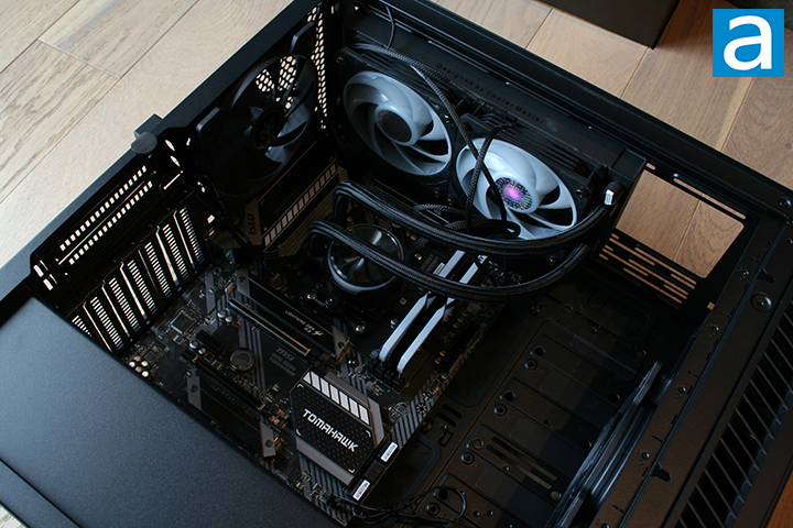 Now, for the fun part: Building my PC. I began by installing my motherboard into the case. The SilverStone SETA Q1 supports ATX, mATX, and mITX-sized motherboards, which was perfect for my MSI MAG B550 Tomahawk in the ATX form factor. My motherboard has an AMD Ryzen 5 5600X CPU, Thermaltake TOUGHRAM XG RGB DDR4-4000 2x8GB memory kit, and Samsung 970 EVO 1TB SSD installed. To make the most of the various mounting options, I installed the Cooler Master MasterLiquid PL240 Flux for cooling. The radiator had no problem fitting to the top of the case.
