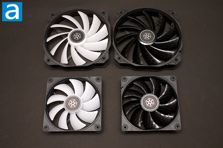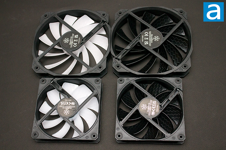 Taking a look at SilverStone's Shark Force collection, there are many similarities across the board. As so, I will be commenting on them all very generally, while pinpointing the specific differences found between them. Looking at the non-RGB models, the SF120B and SF160B have full black exteriors. The RGB variants utilize a translucent blade, simulating the design of many other RGB fans. This is the only visible difference. As usual, SilverStone placed their logo on the center of the impeller. The mounting holes for all fans are padded in the shape of a circle around the hole on both sides. These will dampen sufficiently, but a larger pad would have been a bonus. Both 120mm fans have the regular thickness of 25mm, while the larger 160mm fans has a thickness of 27mm. 140mm variants are also available at press time.