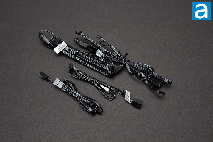On the output side for all fans, four arms are attached to the frame with a single arm seen in the image above. These arms will obstruct minimal amounts of air passing through. The non-RGB models have a place to plug in a cord for power, while the RGB variants have an additional LED cable to be plugged in. When looking at both fans, it is clear both models of fans share the same frame, as the LED plug area still exists, but is simply covered up. The power cable utilizes a 4-pin header for PWM control, and the LED cable has a standard 3-pin for ARGB control. The power cable has a length of 500mm and extends with two ends 40mm and 100mm. The LED cable extends a daisy chain port 100mm off of the start of the cable. This cable has a length of 400mm and extends an additional 40mm and 100mm on the end. This should be long enough to maneuver around most cases. The cables are quite flexible, but they are not braided. A braided cable would be appreciated as it enhances durability.