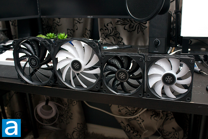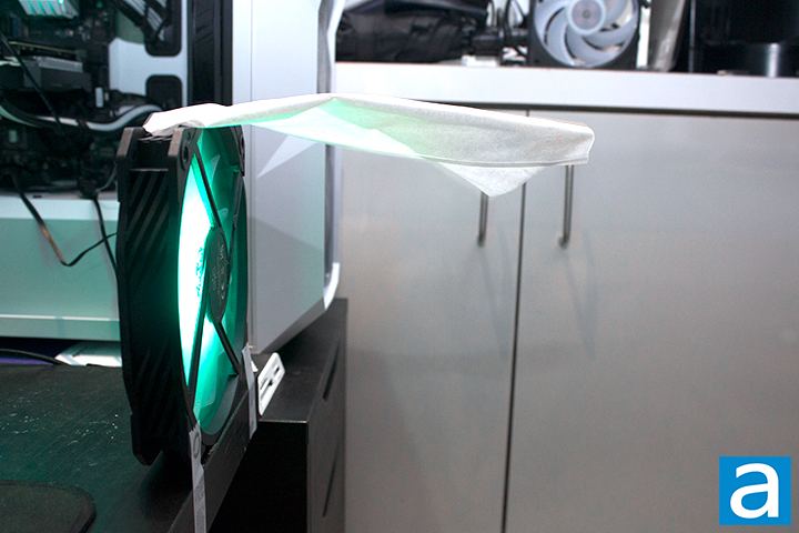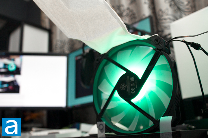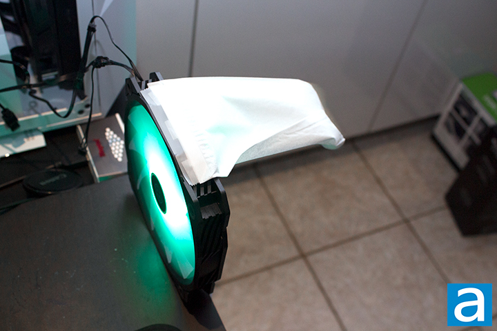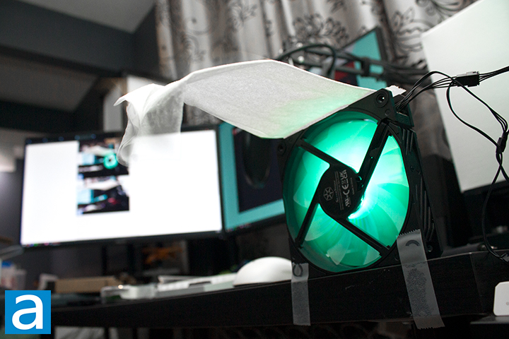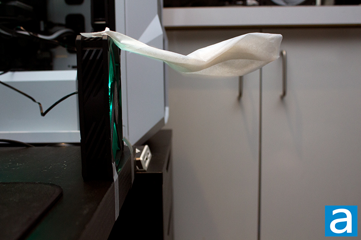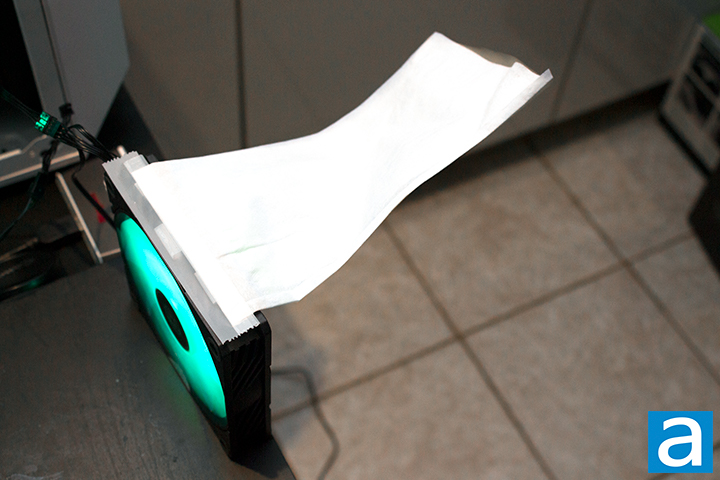 To test the performance of all of the SilverStone Shark Force series, our testing method invented right here at APH Networks was used. Although this test may not be the most comprehensive of tests, the results are qualitatively displayed at a minimum cost by using a piece of tissue paper and tape. As shown in the above photos, a piece of tissue paper was attached on the top of a fan. The tissue paper should be able to naturally fall down and cover the air outlet side -- the side where the motor rack is located -- of the fan. The fan is placed on the edge of a table to prevent air from reflected off any other surface to not skew results. Once the fans were powered on, the airflow, airflow consistency, and the amount of static pressure can be evaluated by observing the behavior of the tissue paper. Additionally, as the non-RGB and RGB variants performed similarly from my tests, we will only be displaying the results of the SF120B-ARGB and SF160B-ARGB for simplicity.