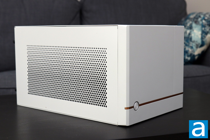 From this vantage point, you can get a better view of the front and left-side panels on the SilverStone SUGO 14. On the plastic front, there is a gold accent line that intersects with the circular power button. The power button is surrounded by a white ring translucent diffuser, which covers the power status LEDs. A second orange LED can be found to the left of the power button and this is used to indicate hard drive activity. On the far side of this front panel is a plastic cut out. This lets users actually install a 5.25" drive such as a Blu-ray or DVD drive. While internal optical drives are becoming as rare as the Gros Michel banana, they still have their place on small form factor builds, especially since these builds are often used in the home theater. You will need to pop out this plastic panel and slot in another one with a large cut out for the drive. On the left panel, we have a side with many perforations for airflow. This area is filtered by a plastic mesh, as we will see later in our review.