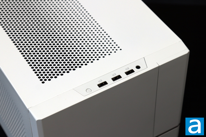 At the top, you can get a better picture of the other I/O. As mentioned previously, the power button is located on the front of the case, away from this grouping. From left to right on the photo, we have a small circular reset button, two USB 3.1 Type-A ports, USB 2.0 port, and a combination audio jack for both headphone and microphone. It is a bit of a strange thing to see a USB 2.0 port on the front panel, and I wish this was swapped out for a USB Type-C connection. It is true that there are only a handful of mini ITX boards with the internal header support for the new connector, but I think this will only become more common. I also would have liked to see an audio splitter included with the SUGO 14, even if they are relatively inexpensive to buy separately. From this shot, you can also get a better picture of the design of the perforations on the top panel. SilverStone has employed a neat design with the holes smoothly transitioning in size of their holes. I am not sure about the purpose of this, other than creating a neat looking effect.