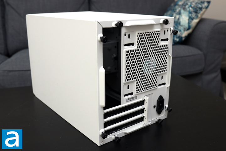 Flipping the case to the other side, you can get a better idea of the back and only solid side panel. At the back, everything is pretty standard for a mini ITX box. The rectangular hole is used for inputs and outputs on the motherboard, and we have rail slots and a honeycomb opening for the exhaust fan at the back. Underneath, we have three expansion slots. While most mini ITX or mini DTX cases have only a single PCI Express slot, graphics cards are becoming large enough to utilize all three expansion slots. Rather than limit users to only dual-slot design cards, I am happy to see manufacturers like SilverStone take this into regard to accommodate for these chunkier cards. Finally, we have a standard AC power plug for the internally mounted power supply, which we will take a look at on the next page. From this back edge, you can also see that all of the panels are held on with captive thumbscrews, and thus are easily removable.