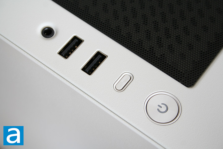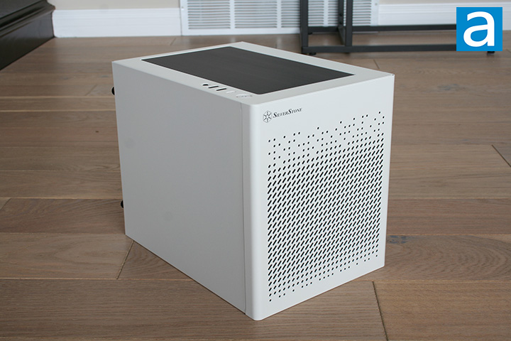 From this angle, you can get a good look at the front and left side panel. It should be noted that the side panels can be interchanged with each other, although this is not new for PC cases. The left-side panel is simply a solid white surface with nothing of note. The front panel has an array of ventilation holes for intaking or exhausting air. The SilverStone brand name and logo is printed on above. Behind the front panel, you can also mount a 3.5" HDD or 2.5" SSD here instead of a fan, if you so desire. If you are using an ATX power supply, you are limited to mounting an 80mm or 92mm fan. Your cooling options are a lot more versatile if you use an SFX power supply, with those options being a 120mm fan or 120mm radiator if you choose to go with liquid cooling.