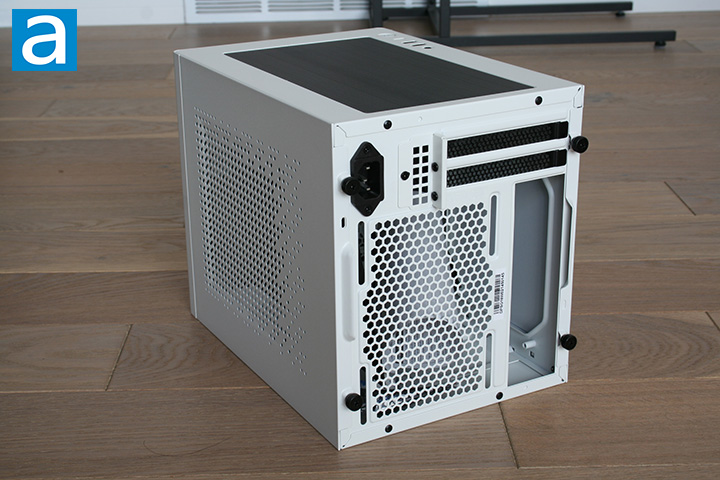 At the back, everything is fairly standard for a mini DTX/ITX box case. Here, we can see the opening for the motherboard I/O, honeycomb opening for an exhaust fan at the back, and two expansion slots. It would have been nice if there were three expansion slots for chunkier cards like what we saw on the SUGO 14. Finally, we have a standard AC power plug for your power supply, which we will look at in more detail next page. We can see all the panels are held on by thumbscrews, which makes it easy to remove them. This angle also gives us a better look at the right side panel, which has ventilation holes for drawing air in or pushing air out.