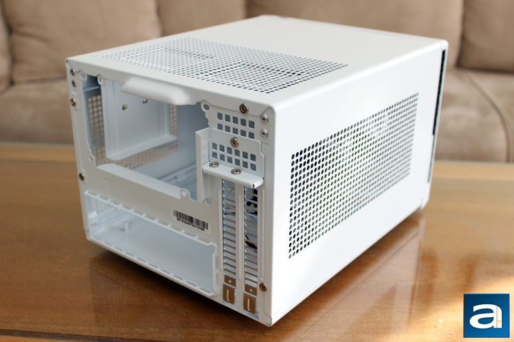 From this angle, there are three spots to speak about. The first two are the top and left sides of the Sugo SG13. The top holds a huge ventilation area, but again can only be used passively as it does not accommodate any fans. Oddly, there are two indentation marks here, but they do not seem to serve any purpose other than for looks. As this is where the power supply is to be mounted, users could place their power supply facing up or down, each with their own benefits. However, it should be noted there is no mesh cover here, which would have prevented dust from settling into the power supply. The left side has the largest area of circular ventilation holes and this is closest to the video card. Non-reference cards are quite common as they expel heat away from the video card and into the enclosure, unlike the reference blower style design, meaning these holes will allow for hot air to exit. Once again, there is a lack of meshing here, but it will not be as important if it is used for releasing air.