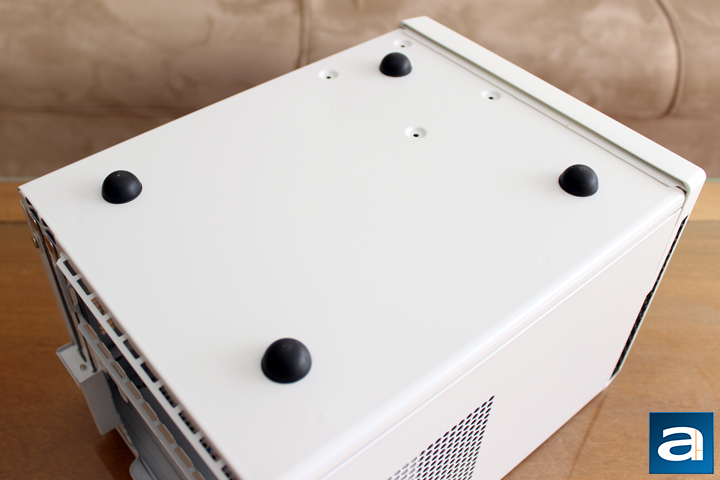 Finally, at the bottom of the SilverStone Sugo SG13WB, we have four exposed black rubber feet. These stick out quite a bit and hold the whole box in place, especially on flat surfaces. The rubber also will help in dampening any vibrations created between the Sugo SG13 and the sitting area. As you may have spotted, there are also four mounting holes. This is where users can install a 2.5" drive inside, but you will see more about this on our next page when we crack the Sugo SG13WB open for a closer look. Otherwise, everything is pretty much as you would expect. I would have liked to see a handle on the Sugo SG13WB, as it would make portability much easier. Even though it is tiny and light enough to carry, I think the handle will be appreciated by gamers.