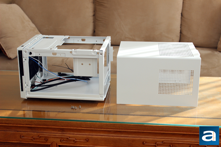 Taking off the shell of the SilverStone Sugo SG13WB involves using a tool we have not expected this early into the review, which is a screwdriver. Most cases utilize thumbscrews, especially on the external panels, but this is not the case for the Sugo SG13WB. It would have been nice to at least see them on the outside, but unfortunately this is not so. Afterwards, I slid the shell off to reveal the inside by pulling at the ridge on the back. As you can see immediately, the entire shell and the inside is fully painted in white, showing SilverStone did not cheap out by leaving the natural aluminum colors. Unfortunately, there are no sound dampening panels here, but their presence would have been more surprising, considering the physical limitations we face with an enclosure this small. The layout of the SilverStone Sugo SG13WB is definitely quite different from other cases, and this again is due to the baby-sized footprint. The motherboard sits parallel to the ground, with the power supply mounted above it. Drives can be placed near the front of the case or under a white bracket. A single dual-slot expansion card can be placed on the left side and intake cooling is found at the front panel. We will look at each of these areas as we continue our internal tour.