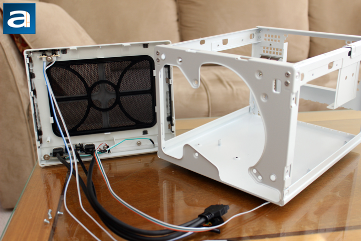 Using a screwdriver is necessary to pop off the front panel, and this is only after you have removed the white shell, as I have already done. From this angle, you can first see the panel and all of its connectors, including the power and hard drive activity LEDs. All of the I/O pin cables are color coded, and while it may look cheap compared to an all-white or all-black finish, it makes installation easier by clearly defining the positive and negative connections. At the front of the Sugo SG13WB, you can see the cutout and mounting holes for a single fan, either 120mm or 140mm in size. You can also fit a water cooler radiator and fan here, with radiators limited to 120mm in size. You could squeeze a 140mm radiator into here, but SilverStone warns this will lead to clearance issues with the graphics card power supply, or both, so your mileage may vary. To the left is another rectangular cutout to accommodate longer video cards.