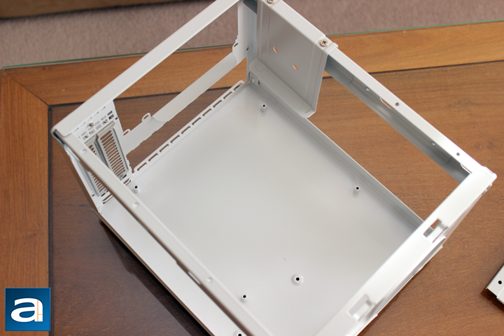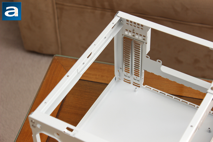 This is a top-down angle shot of the SilverStone Sugo SG13WB, and from this image you can see where the motherboard sits. Lying flat on the bottom are four standoffs placed for the mini-ITX form factor. These standoffs are permanent, which is understandable considering the case is a one size affair. At the front you can just barely see two of the four mounting holes here, where you can place one of your 2.5" storage drives. Additional drives can be placed on a white bracket, which sits over this area, but was removed to take this photo. The bracket can hold up to two 2.5" drives or one 3.5" drive. At the top you can also see an opening for the power supply. As we have mentioned before, the opening is for a full sized ATX power supply. A side bracket also helps in supporting the PSU, distributing the weight of it more evenly.